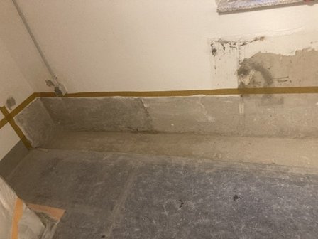 Freigelegte Bodenfläche an Klinkerwand mit aufgetragener heller Masse