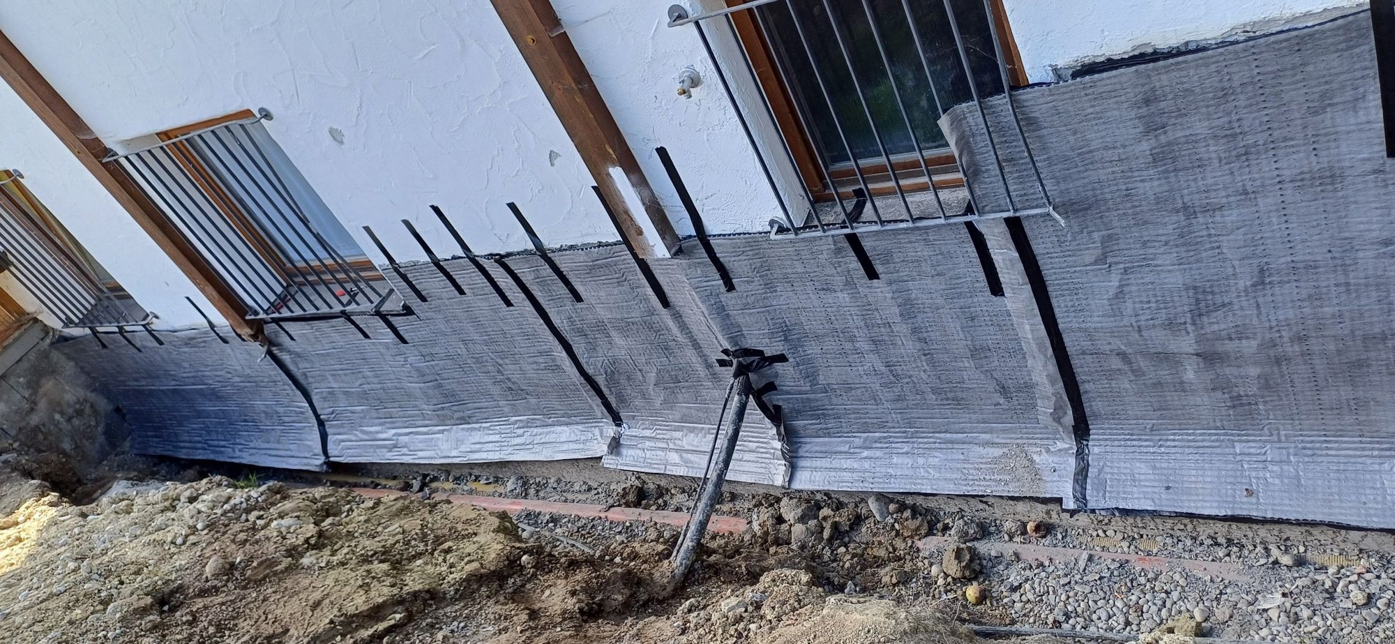 Die Sanierung begann mit dem Entfernen der alten Abdichtung am Haus in Dietmannsried. Eine gründliche Untergrundvorbereitung war entscheidend, um eine optimale Haftung der neuen Wandabdichtung zu gewährleisten. Die ISOTEC-Kombiflexabdichtung, eine flexible polymere Dickbeschichtung, wurde in zwei Lagen aufgetragen. Diese Methode zeichnet sich durch ihre UV-Beständigkeit und schnelle Trocknungszeit aus, was eine zügige Weiterverarbeitung ermöglicht. Nach der Abdichtung wurden Schutzplatten aus Polystyrol vollflächig verklebt, um die Abdichtung vor mechanischen Beschädigungen zu schützen. Diese Platten fungieren auch als Perimeter-Dämmung, die den Wärmeschutz des Gebäudes verbessert. Zusätzlich wurde ein Wurzelschutz angebracht, um die Abdichtung vor möglichen Schäden durch Pflanzenwurzeln zu bewahren. Diese Maßnahmen stellten sicher, dass die Kellerwände dauerhaft trocken bleiben und der Wohnkomfort erheblich gesteigert wurde.
