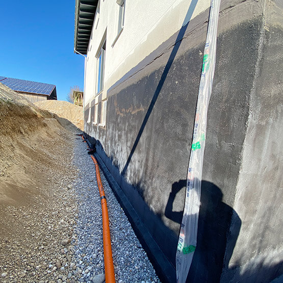 Bei seitlich eindringender Feuchtigkeit ist eine flächige Abdichtung von außen im erdberührten Bereich des Hauses erforderlich. Hierzu wird die betroffene Wandfläche sicher von außen mit unserer mehrschichtigen Außenabdichtung abgedichtet. Das mehrschichtige Abdichtungssystem sorgt für Sicherheit und trockene Wände.